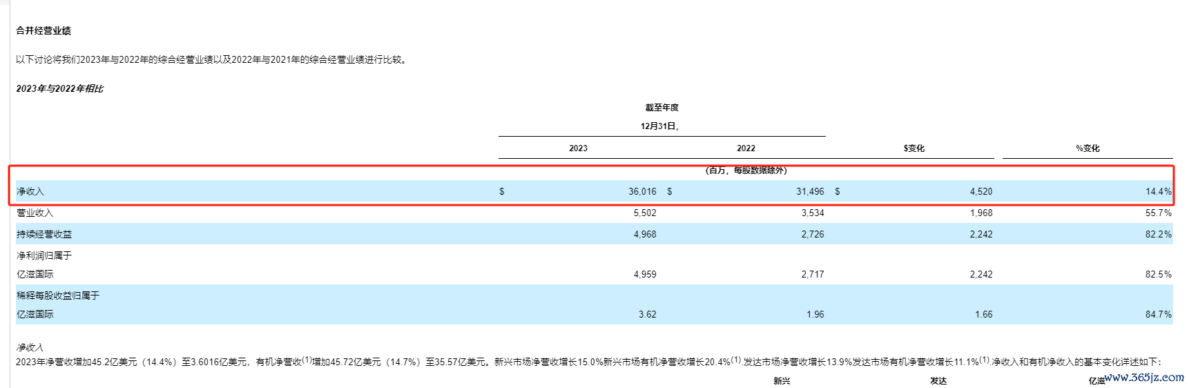 亿滋国际4月底发布的2024年一季报显示,该公司实现净收入92.90亿美元,净利润14.16亿美元。更早的2023年年报显示,该公司实现净收入360.16亿美元,同比增长14.35%,实现净利润49.59亿美元,同比增长82.5%。