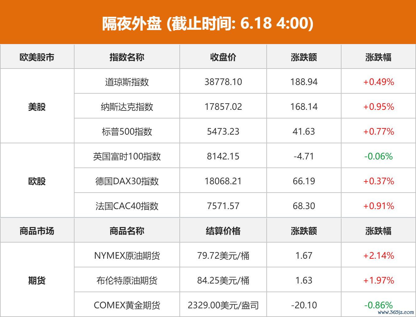 美股市场:美股三大指数集体上涨,纳指、标普500指数再创历史收盘新高,截至当天收盘,道琼斯工业平均指数比前一交易日上涨188.94点,收于38778.10点,涨幅为0.49%;标准普尔500种股票指数上涨41.63点,收于5473.23点,涨幅为0.77%;纳斯达克综合指数上涨168.14点,收于17857.02点,涨幅为0.95%。