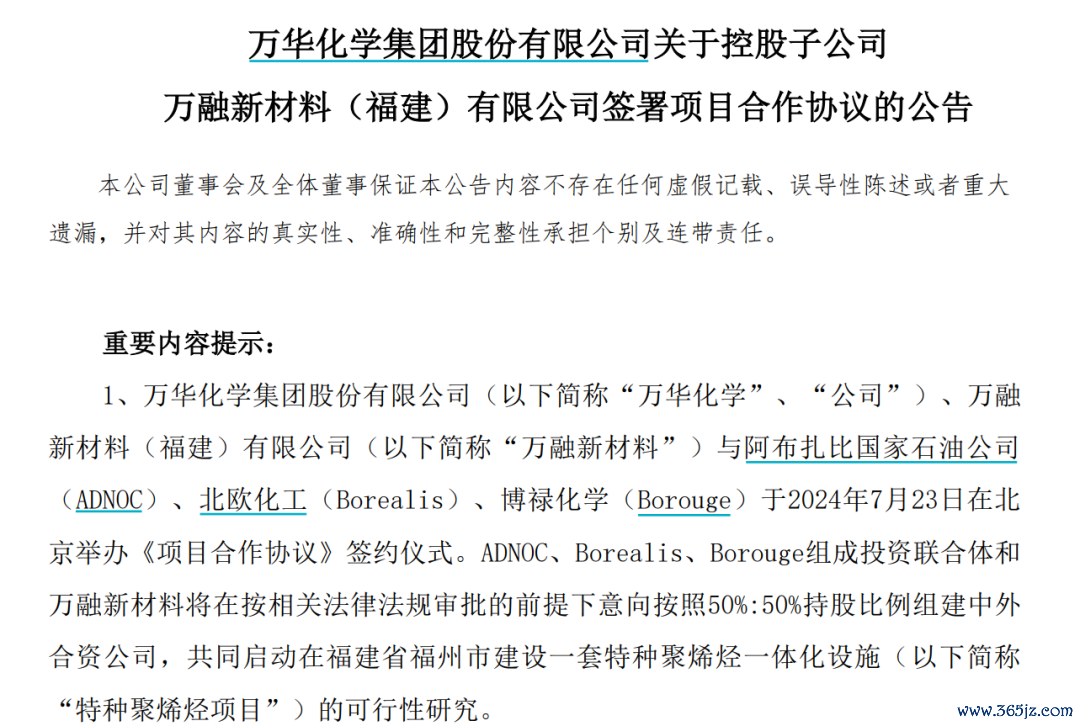7月23日,万华化学公告披露,该公司的子公司万融新材料(福建)有限公司(以下简称万融新材料),与阿布扎比国家石油公司(ADNOC)、北欧化工(Borealis)、博禄化学(Borouge)当日在北京签署《项目合作协议》。